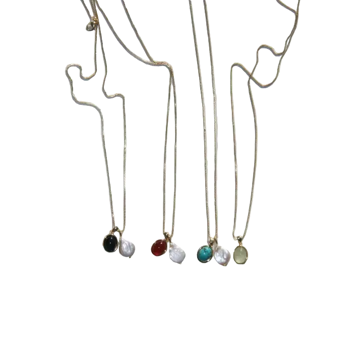 This modern heirloom features a smooth bezel set cabochon gemstone, paired with an organic shaped baroque pearl.