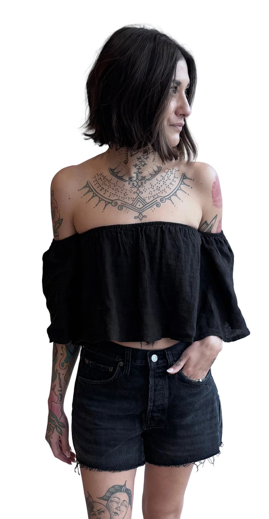 - The Coco Top is a strapless off the shoulder linen top, with a cropped silhouette and a hidden ruched elastic bandeau to ensure ultimate support