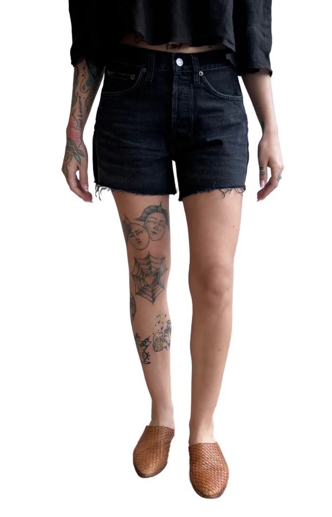 - The Parker Long shorts are crafted from non-stretch, regenerative cotton in a saturated black denim wash, complete with subtle whiskering for a lived-in look