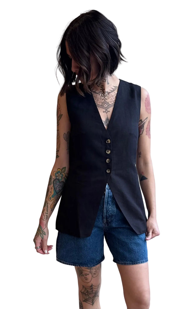 - Sophisticated and sleek, the Longline Vest is crafted from a breathable organic cotton-linen blend
