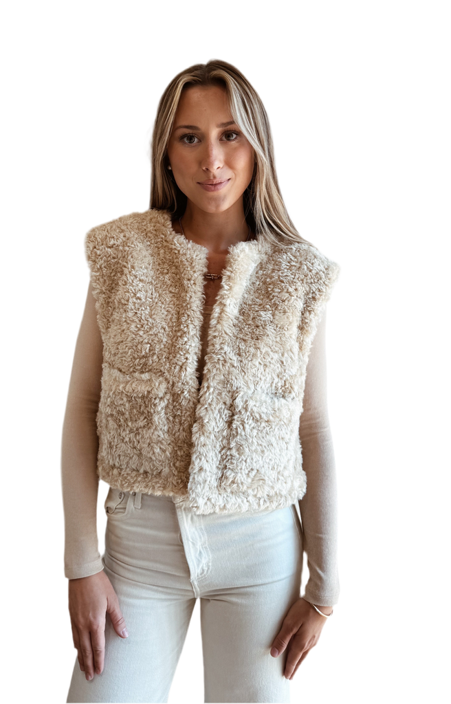 - Two looks in one. This short vest is crafted from a warm wool blend with a soft faux fur reverse, offering versatility and texture in a single piece.