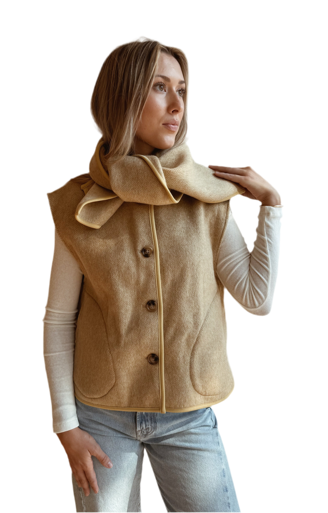 - This sleeveless vest is crafted from a soft wool blend and features an attached scarf detail that wraps naturally around the neck